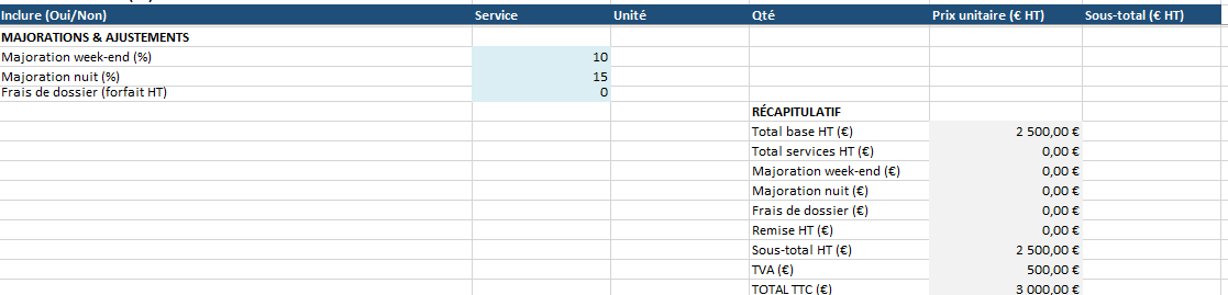 - Sous-total HT = Base + Services + Majoration week-end + Majoration nuit + Frais – Remise.
