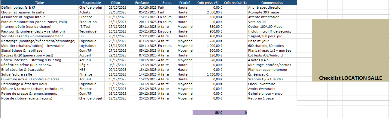 L’organisation d’un événement exige une double rigueur : opérationnelle (qui fait quoi, quand, avec quels livrables) et financière (combien coûte chaque choix, avec quels scénarios et quelles hypothèses). Un modèle Excel bien conçu réunit ces deux exigences : il transforme la préparation en procédures mesurables et la négociation budgétaire en équations transparentes. Le présent article expose la logique d’un modèle type combinant checklist pilotée et simulateur de budget de location de salle, afin d’obtenir des décisions rapides, traçables et défendables.