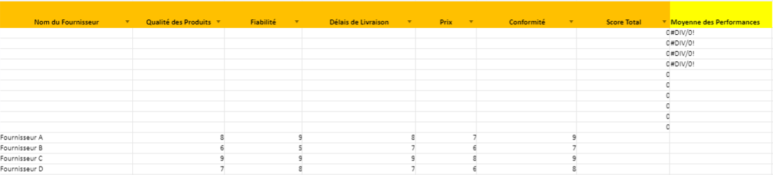 Une fiche d’évaluation ou supplier scorecard est un outil structuré qui permet d’évaluer les fournisseurs selon les KPI définis. Vous attribuez une note à chaque fournisseur sur chaque critère de performance (qualité, coût, délai, etc.).