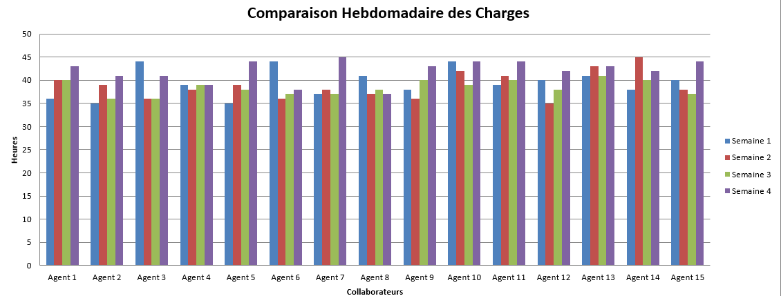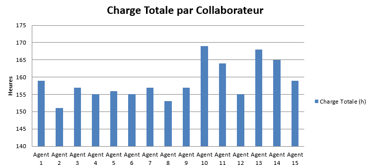 - Pour chaque agent, la charge par semaine est comparée à une capacité cible (ex. : 40 h)