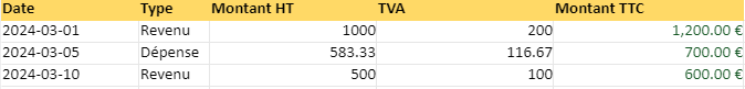 - Vous pouvez ajouter des colonnes pour les taxes si nécessaire.
