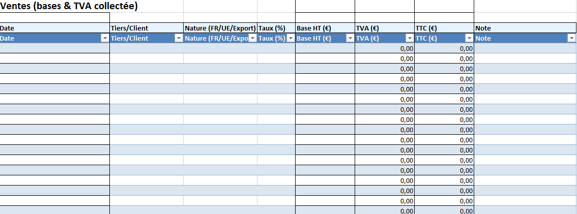 - Totaux : bases et TVA collectées vs déductibles.