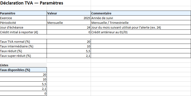 - Nouveaux taux (DOM, services, cas particuliers) : ajoutez une ligne dans Paramètres.