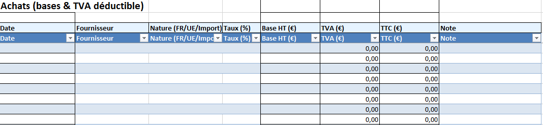- Déductible : la TVA sur vos achats affectés à des opérations ouvrant droit à déduction.