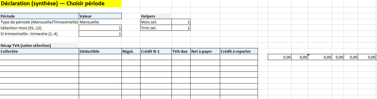 - Historique — une feuille pour archiver chaque période (début/fin, collecte, déductible, nette, date d’archivage).