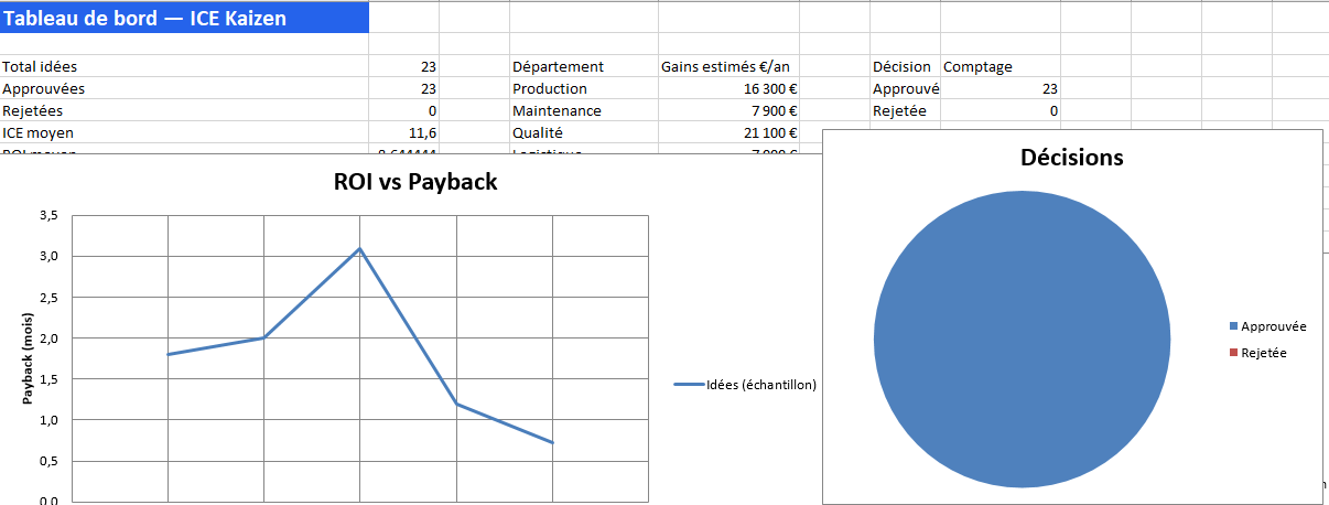 - KPI : total d’idées, approuvées/rejetées, ICE moyen, ROI moyen, payback médian.