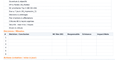 - Mensuel (60 min) : revue ROI/Payback, passage en standard, diffusion des bonnes pratiques.