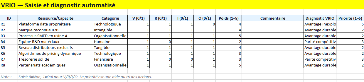 - Décider des échelles : Importance/Sévérité (1–5), Evidence (Oui/Non), Force (1–5), Poids VRIO (1–5).