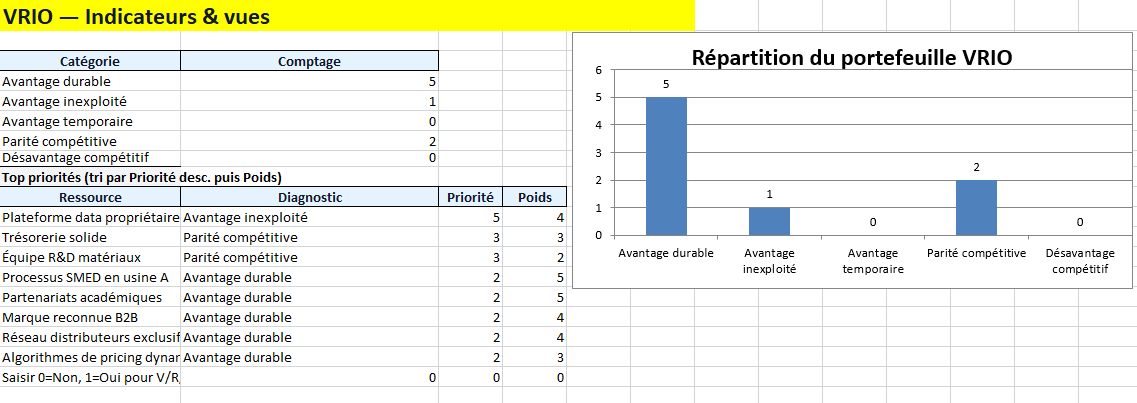 - VRIO : répartition des diagnostics + Top priorités.