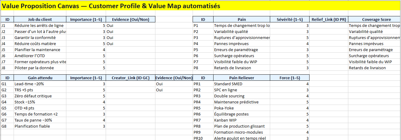 - VPC : pains majeurs = pannes imprévues, variabilité qualité. Relievers = maintenance prédictive, SPC en ligne. Pain Fit = 65 %, Gain Fit = 58 % → poursuivre l’ajustement.