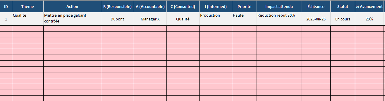 - Actions : on enregistre tout dans Plan_d’Actions (RACI, priorités, échéance, %).