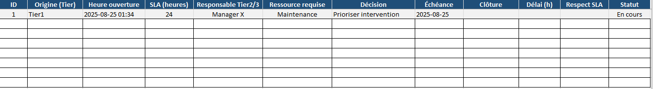 - Si blocage : on crée une ligne dans Escalade_Tiers (C = ouverture, D = SLA, H = échéance, I = clôture à la résolution).