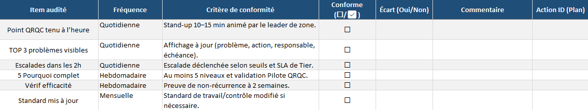 Le classeur QRQC_Checklist_Implementation_FR.xlsx fourni contient ces briques prêtes à l’emploi : Checklist_Deploy_QRQC, Meeting_Tier1, Escalade_Tiers, Plan_d’Actions, KPI_Synthèse, Audit_Routine et Guide.