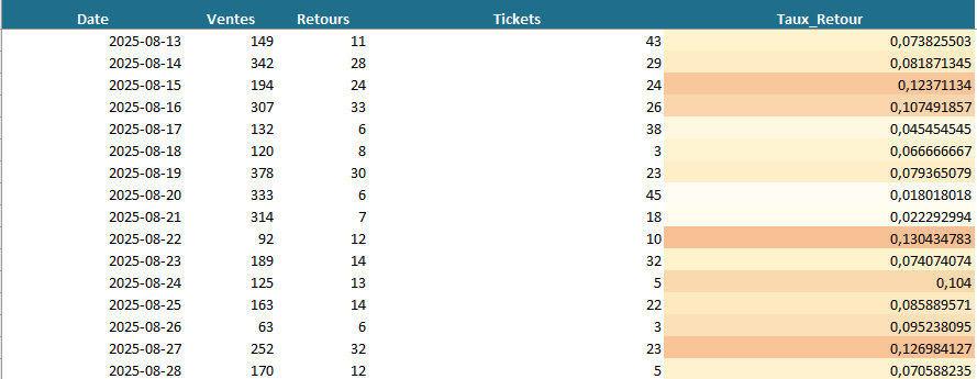 • KPI_Journalier : vous voyez Ventes, Retours, Tickets et le taux de retour jour par jour (60 jours).
