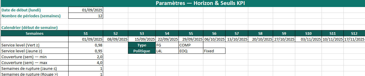 Horizon de 12 semaines démarrant un lundi, dates auto, seuils KPI réglables (service level, couverture). - Articles