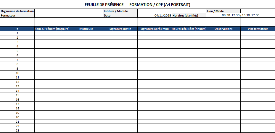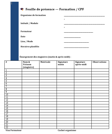 Formation / CPF — émargement matin & après-midi, visa formateur, mode (présentiel/distanciel/hybride).