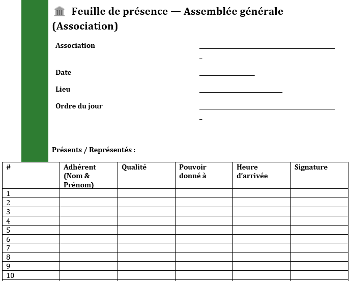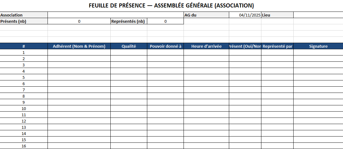 AG d’association — présents / représentés, heure d’arrivée, signatures, mini-compteurs pour le quorum.