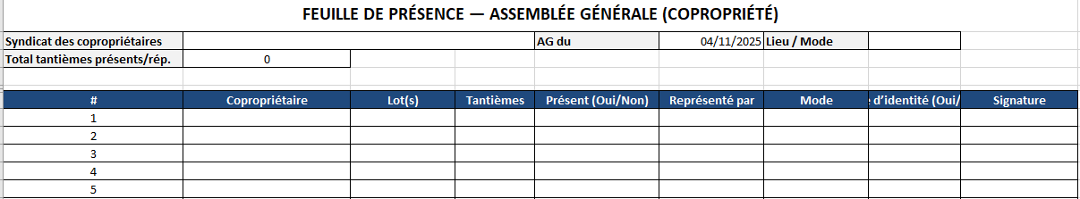 AG de copropriété — copropriétaire, lots, tantièmes (total calculé), présent/représenté, mode (présentiel/visio/pouvoir).