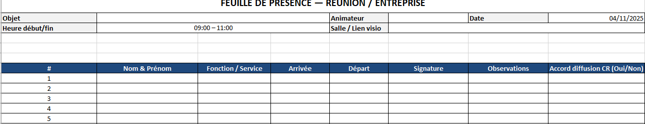 Une feuille bien tenue n’est pas une fin ; c’est un début. Pour une réunion, elle prépare la diffusion du compte-rendu ; pour une formation, elle soutient le dossier de financement ; pour une assemblée, elle fonde le quorum et sécurise les délibérations. Autrement dit, le document n’est pleinement utile que s’il déclenche la suite : un envoi, une synthèse, une décision. D’où l’importance d’un en-tête clair (objet, date, lieu) : on ne cherche pas l’information, on enchaîne.