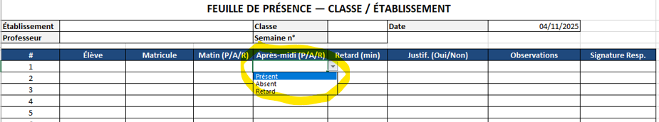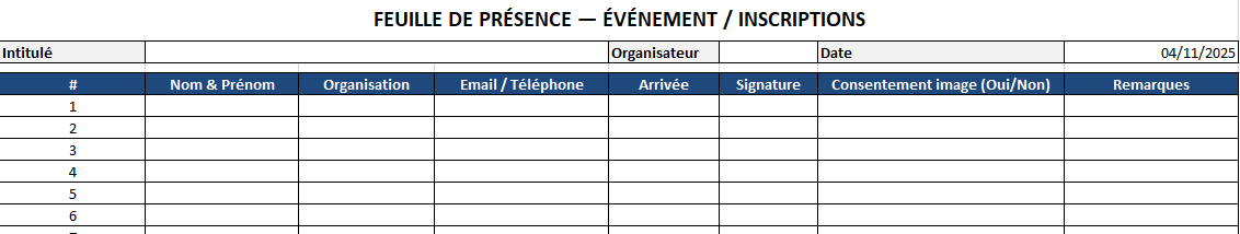 La présence est un droit simple, elle doit le rester. Police lisible, contrastes suffisants, lignes d’écriture confortables : ces attentions n’appartiennent pas au “nice to have”, elles relèvent de l’hospitalité documentaire. Ajoutez, si besoin, une ligne bilingue (FR/EN) pour l’intitulé, ou un lexique miniature en marge (P = Présent, A = Absent, R = Retard) pour lever toute ambiguïté. La meilleure feuille est celle que tout le monde comprend sans explication.