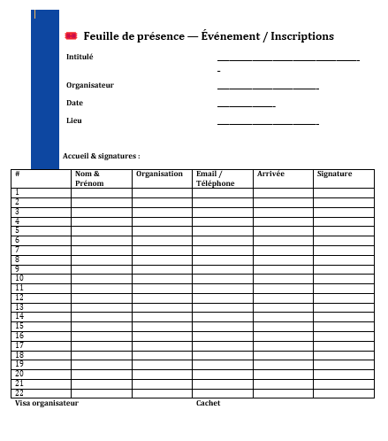 Il n’y a pas de “belle” feuille de présence ; il y a des feuilles justes. Celles que l’on remplit sans soupirer, que l’on retrouve sans chercher, que l’on brandit sans rougir. À ce titre, le ruban vertical, les pictos, le cachet ne sont pas des parures : ce sont des repères qui allègent la charge mentale et rendent la présence incontestable. Le reste — la qualité du débat, le contenu de la formation, l’énergie d’une assemblée — ne dépend pas du papier. Mais il gagne à s’appuyer sur un support fiable, clair, et suffisamment discret pour s’effacer aussitôt sa mission accomplie.