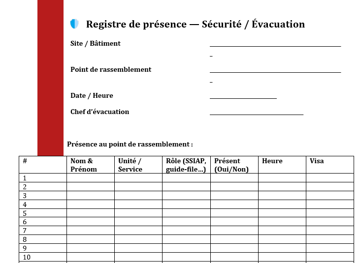 Sécurité / Évacuation — point de rassemblement, rôle (SSIAP/guide-file), présence, heure, visa sécurité.