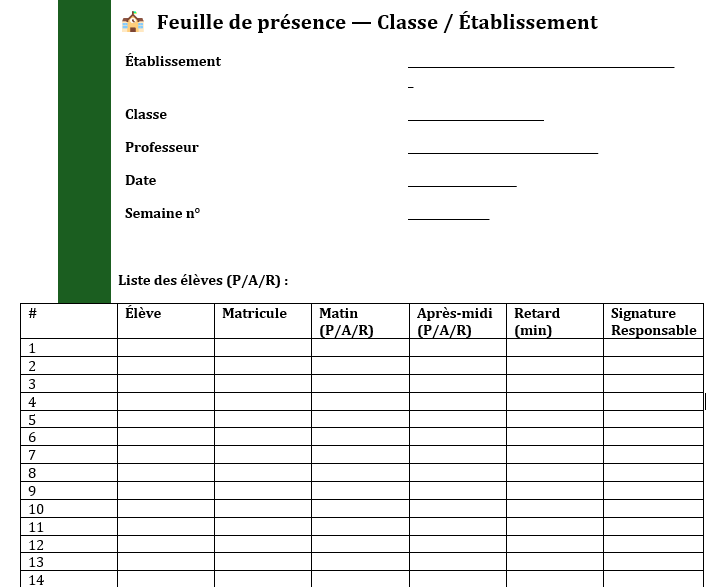 - Le titre du document : Feuille de présence journalière / hebdomadaire