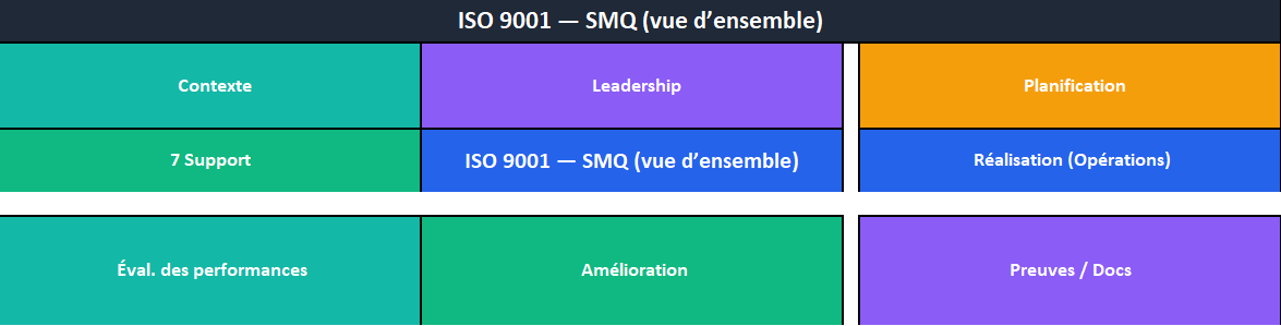 - Carte — ISO simplifiée : vue d’ensemble par clauses (4→10) pour expliquer le SMQ au COMEX et aux chefs d’atelier.