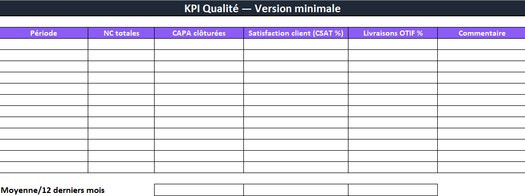 - Indicateurs — KPI : tableau minimal (NC/mois, CAPA clôturées, CSAT %, OTIF %) avec moyennes automatiques.