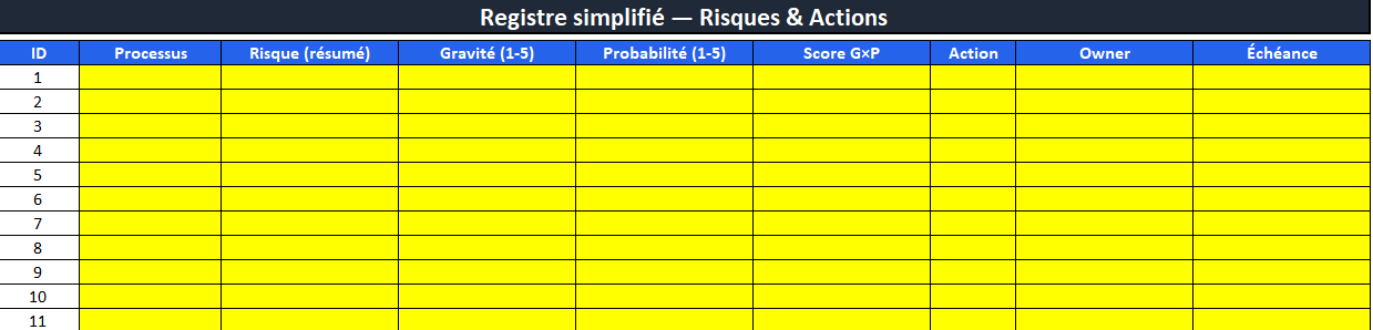 - Risques : ouvrez 5 risques, attribuez une action, un owner, une échéance.
