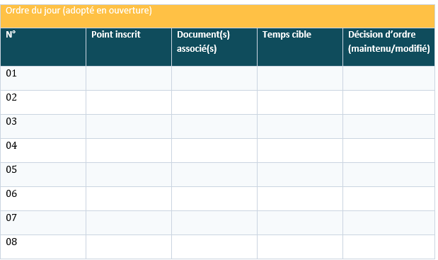 En séance. L’ordre du jour est adopté en ouverture. Chaque point vise une bifurcation claire : on tranche, on reporte avec conditions, ou l’on renvoie en “parking” pour arbitrage ultérieur. Les décisions sont relues à chaud en fin de séance pour éviter les équivoques.