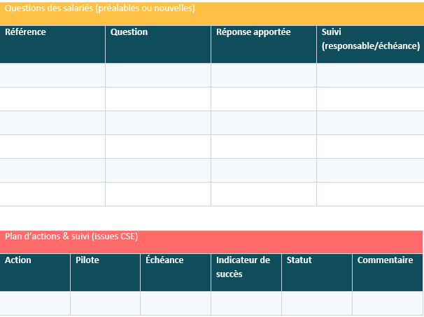 Le compte rendu CSE suivant s’ouvre sur un encadré de poursuite : nombre d’actions ouvertes, clôturées, en retard ; trois décisions emblématiques et leur statut ; points de blocage et arbitrage sollicité. Cette mise à jour tient sur un quart de page et conditionne la crédibilité du dispositif.