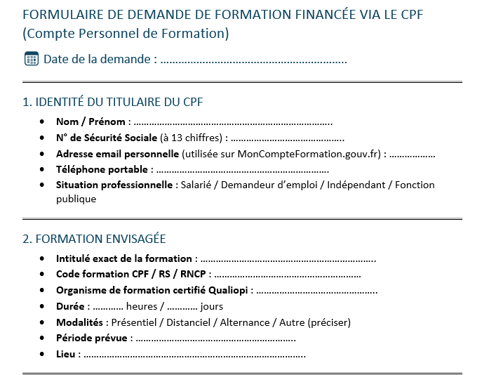 Ce modèle vise à formaliser toute demande de formation éligible au Compte Personnel de Formation (CPF), qu’elle soit initiée par un salarié, un demandeur d’emploi, un indépendant ou un agent public. Il s’inscrit dans un cadre administratif rigoureux, conforme aux règles en vigueur sur la plateforme moncompteformation.gouv.fr, tout en étant pratique et orienté terrain.