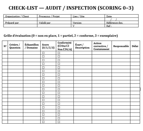 - Preuves manquantes → rendez la colonne Preuves/Observations obligatoire sur les points critiques.
