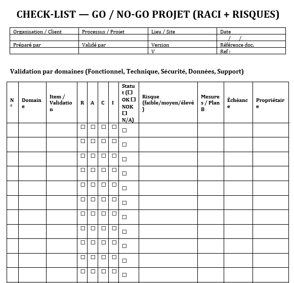 - Structure : Domaine, Item/Validation, R/A/C/I, Statut (OK/NOK/N/A), Risque (faible/moyen/élevé), Mesures/Plan B, Échéance, Propriétaire.