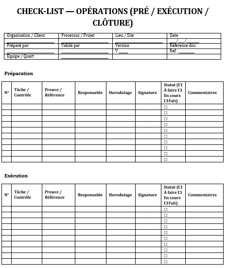 4) Check-list Opérations (Pré / Exécution / Clôture)