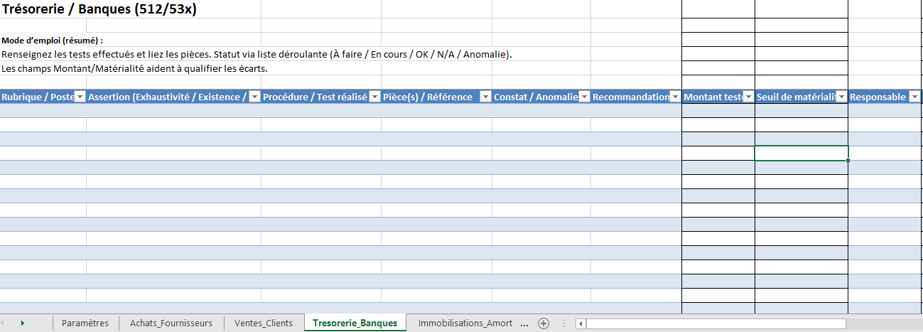 3) Feuilles de cycle : pour chaque poste, décrivez la procédure/test, joignez les références, sélectionnez le Statut via la liste déroulante, consignez constats et recommandations. Les colonnes numériques sont formatées en euros.