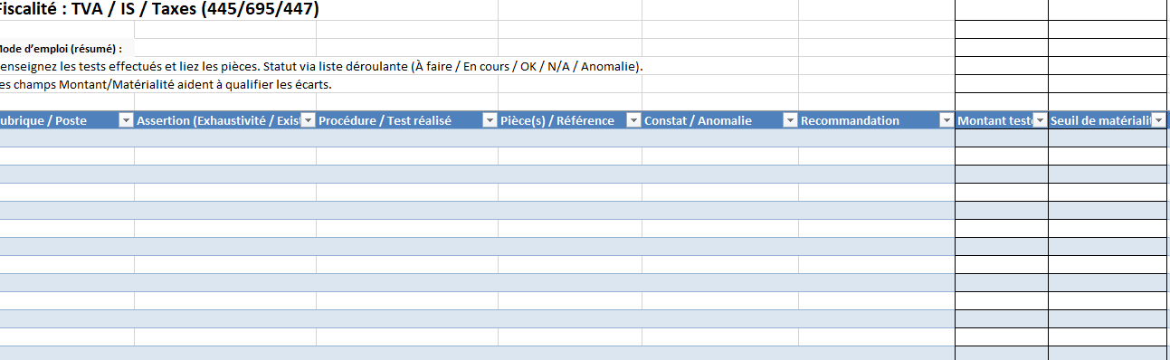 Ce modèle outille la révision comptable courante et les diligences usuelles par cycle. Il ne remplace ni le jugement professionnel, ni les exigences spécifiques applicables à certains secteurs, ni les travaux d’audit légal au sens des NEP. À adapter à votre cabinet et à vos clients.