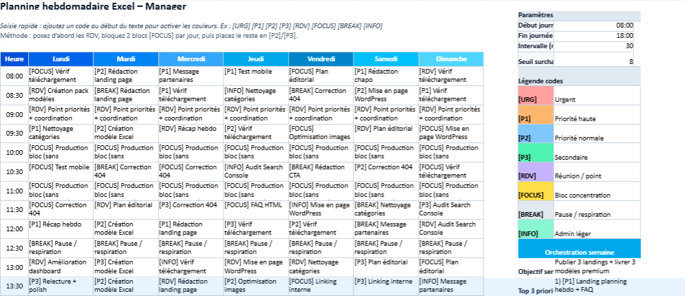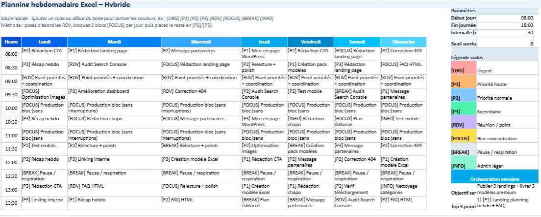 Dans un planning, cette nuance est souvent la plus importante. C’est pourquoi le modèle peut intégrer des codes visuels (priorités, urgences, réunions, focus) afin que la semaine se lise plus facilement.