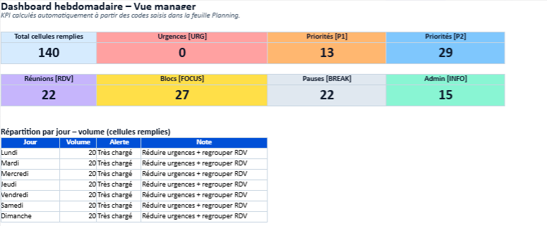 À partir du planning rempli, un dashboard automatique synthétise l’essentiel : volume d’activité, urgences, priorités hautes, réunions, blocs de concentration, répartition par jour.