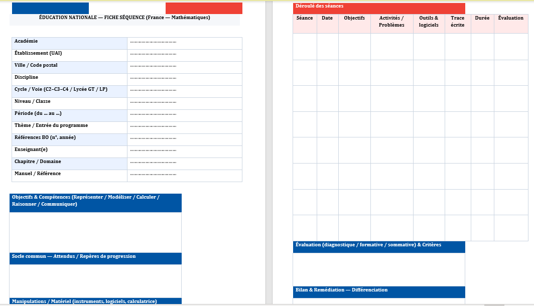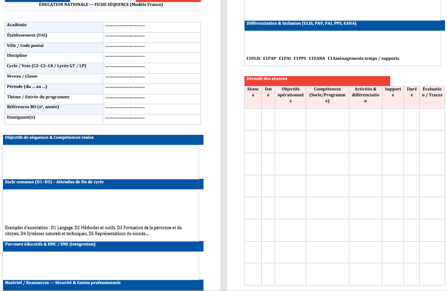 Télécharger des modèles – Fiche séance Vierge – Pack thématique prêt 🎒 Suivant la même charte France (bandeau tricolore, champs BO/Académie, Socle, inclusion, RGPD)