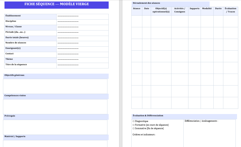 Conçu pour les classes françaises du primaire au lycée, ce pack réunit des modèles de fiches séquence harmonisés par une même charte visuelle tricolore. Chaque modèle reprend les incontournables du cadre national — références au Bulletin Officiel, Socle commun, dispositifs d’inclusion (ULIS, PAP, PAI, PPS, EANA), RGPD et droit à l’image — tout en restant lisible, imprimable en A4 et immédiatement opérationnel. L’objectif est double : réduire le temps de préparation et augmenter la clarté pédagogique, du premier cadrage jusqu’aux traces d’évaluation.