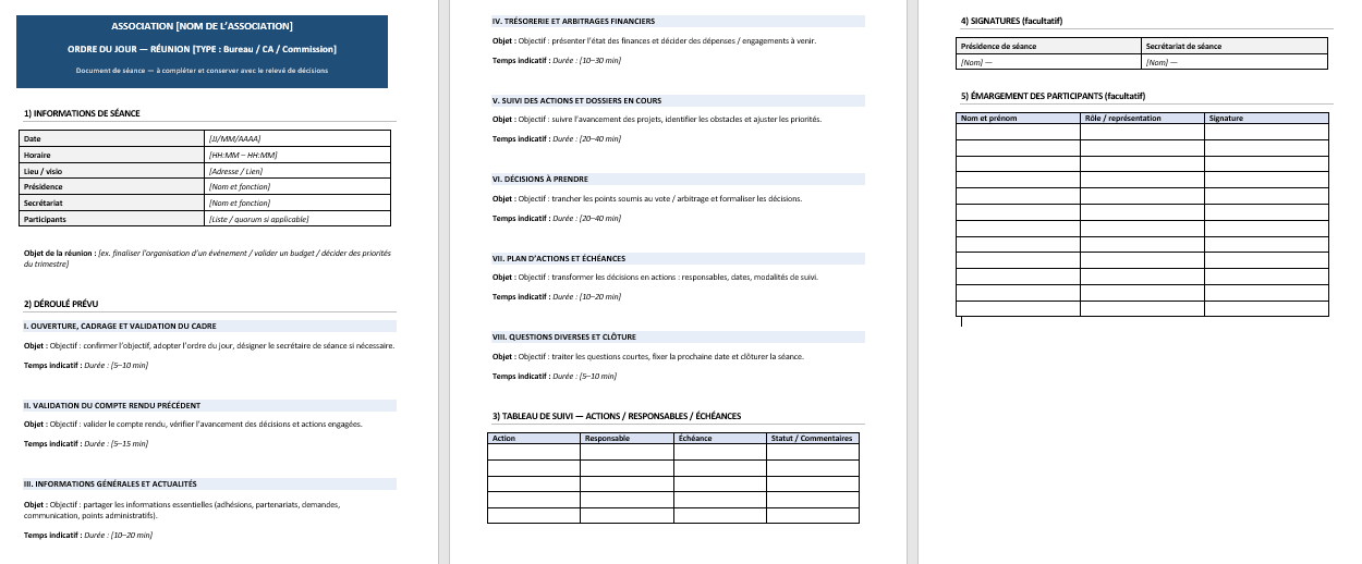 Des documents sobres, clairs, prêts à remplir, conçus pour être utilisés en réunion comme au bureau, puis archivés sans ambiguïté.