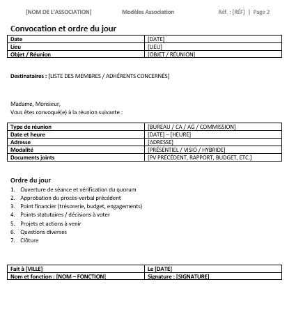 - Convocation et ordre du jour (réunion, bureau, CA, AG)