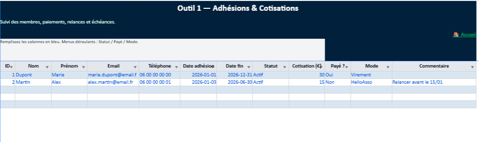 - Remplissez d’abord deux onglets Excel : Adhésions et Trésorerie.