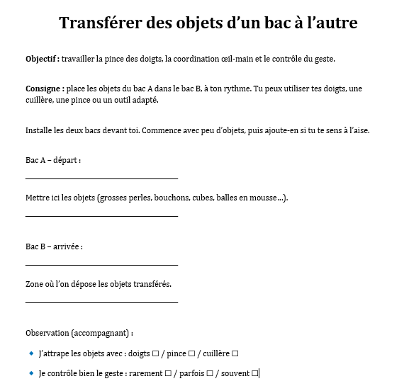 Ce type d’exercice permet d’observer finement la manière dont la main s’organise. Certains auront besoin d’objets volumineux, légers, faciles à saisir, comme des balles en mousse ou des bouchons. D’autres pourront manipuler des éléments plus petits, comme des perles ou des cubes. L’accompagnant peut ajuster le nombre d’objets, le temps d’effort, les pauses nécessaires. L’espace “Observation” en bas de la fiche invite d’ailleurs à noter le mode de préhension utilisé, la fréquence des lâchers incontrôlés, le degré de contrôle du geste. On ne cherche pas la performance, mais la répétition régulière de gestes adaptés, sans douleur inutile ni découragement.