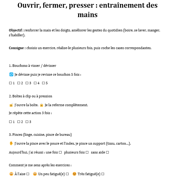 La fiche propose des séries limitées (par exemple cinq vissages/dévissages, trois ouvertures/fermetures) avec des cases à cocher. Ce dispositif permet de visualiser l’effort accompli, de donner un début et une fin à la tâche, et de discuter du ressenti : la main est-elle très fatiguée, légèrement endolorie, au contraire plutôt tonique ? L’accompagnant peut ainsi ajuster le programme en fonction des retours et de la tolérance de la personne accompagnée.