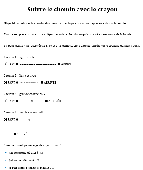 La fiche encourage une évaluation nuancée de l’effort : beaucoup dépassé, un peu dépassé, resté dans le chemin. Cette échelle simple permet d’éviter un jugement binaire “réussi / raté” et ouvre sur des échanges : qu’est-ce qui a aidé, qu’est-ce qui a rendu l’exercice difficile, comment aménager la séance suivante (format A3, feutre plus épais, chemin plus large, pauses plus fréquentes, etc.) ?