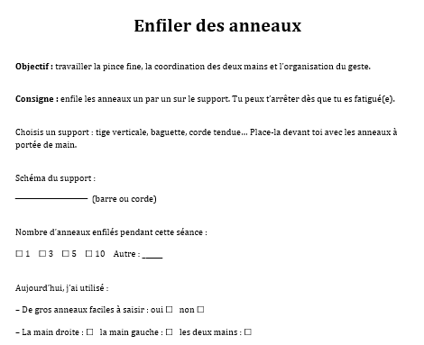 Pour de nombreuses personnes en situation de handicap, ces gestes conditionnent des actes très concrets : mettre une assiette sur un plateau, accrocher un cintre, enfiler des bracelets, ranger des anneaux de rideau, manipuler des câbles ou des embouts. La fiche prévoit un espace pour noter le nombre d’anneaux enfilés pendant la séance, mais insiste aussi sur la qualité de l’expérience : utiliser des anneaux plus gros ou plus petits, travailler avec la main droite, la main gauche, les deux mains, observer la fatigue musculaire.