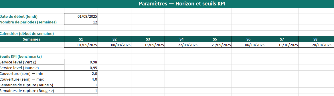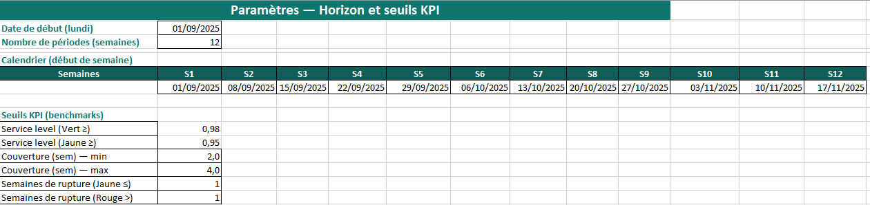 Paramètres définit l’horizon de 12 semaines et les dates de début de semaine. Il contient aussi les seuils KPI (benchmarks) utilisés pour le code couleur